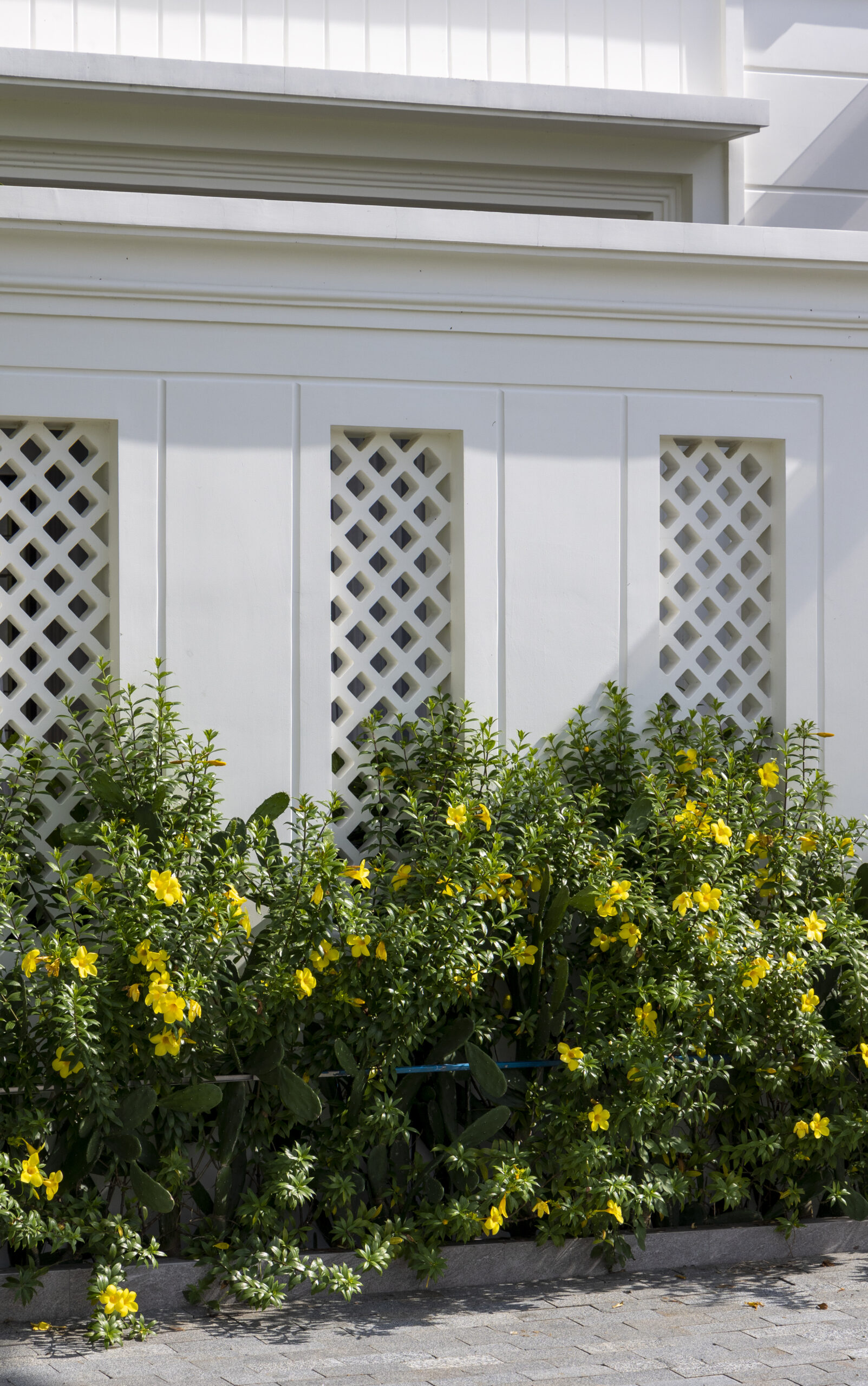 Giải pháp đưa mảng xanh vào thiết kế kiến trúc 1. Ban công phủ hoa và dây leo: Tận dụng khoảng không gian ban công để tạo giàn hoa giấy, hoa leo – vừa đẹp mắt vừa che nắng hiệu quả. 2. Sân vườn xanh mát: Lựa chọn cây bản địa, dễ chăm sóc như cau cảnh, lộc vừng, trầu bà cột, tạo nên khu vườn xanh bền vững. 3. Tiểu cảnh trong nhà: Bố trí cây xanh nội thất ở phòng khách, phòng làm việc hoặc giếng trời để tăng năng lượng tích cực. 4. Tường cây đứng: Giải pháp hiện đại giúp tối ưu diện tích, biến những bức tường đơn điệu thành “bức tranh thiên nhiên”.
